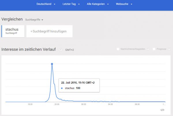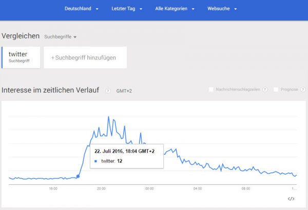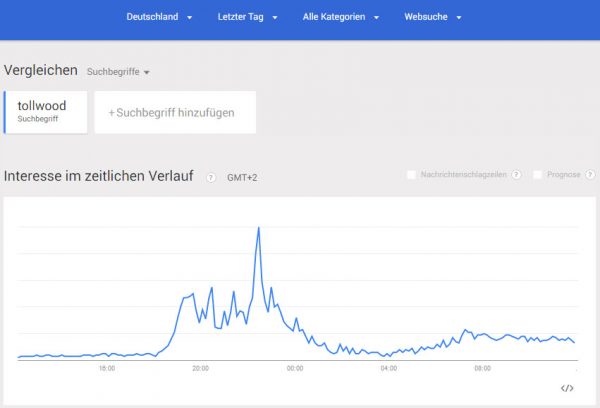 Die Nachfrage nach Tollwood fand seine Spitze um 22:28 Uhr – zuvor, um kurz nach 19:00 Uhr, war die Nachfrage zum Gerücht, dass es auf dem Festival Schüsse gegeben hat, am Höchsten.